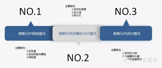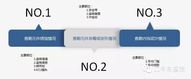 總結:以上介紹了很多內(nèi)飾里面檢測的位置,但我通常僅通過以下幾個位置去判斷車輛是否有泡水痕跡。我主要觀察車輛主駕駛這一側的情況:當你打開主駕駛的車門,首先觀察這一側的車輛門檻,看是否有砂石,泥土的情況,大線是否有更換痕跡;然后查看座椅的滑道,看滑道是否有大面積的銹蝕情況,座椅螺栓是否有更換痕跡,順著這個方向繼續(xù)檢測座椅下面的底板,看座椅底板是否有銹蝕痕跡,這一個檢測位置是很多評估師容易忽略的位置,切記一定要檢測;最后把頭轉過來,看一下轉向柱的底部,是否有大面積的銹蝕,包含這一側的踏板,注意有的車輛不是水泡車,轉向柱底部也會銹蝕,然后在查看這一側的車身ECU,看線束的插頭是否有銹蝕,泥沙痕跡。當你檢測完這一側的所有項目的時候,你基本可以判定車輛是否是水泡車。